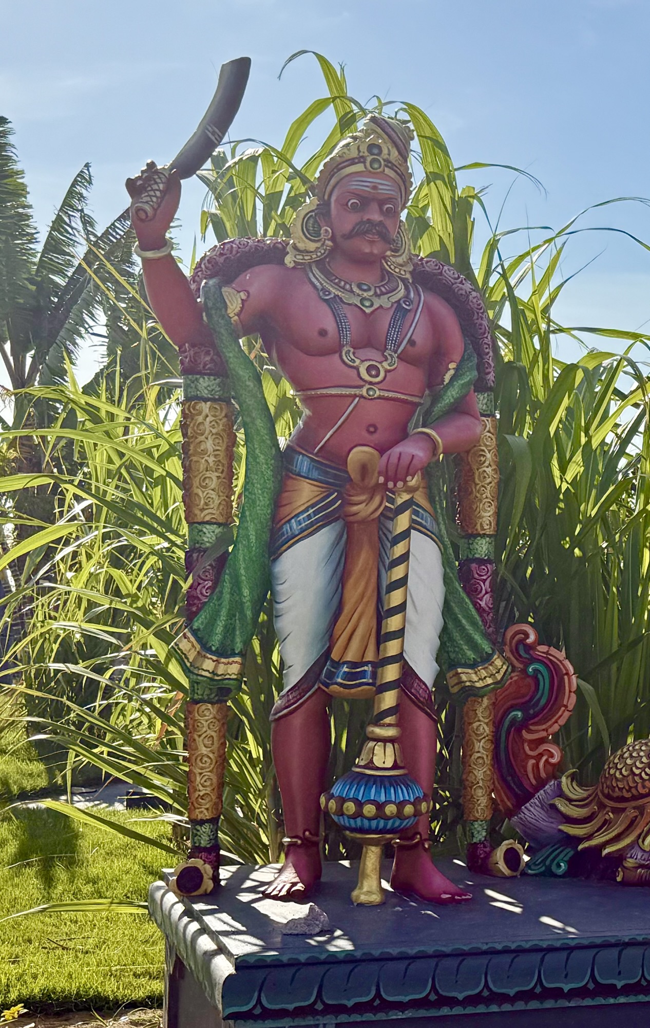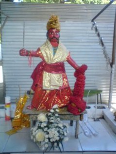 En signe de châtiment, il fut condamné à servir éternellement la déesse Sri Mariamman, en la protégeant sans jamais pouvoir :