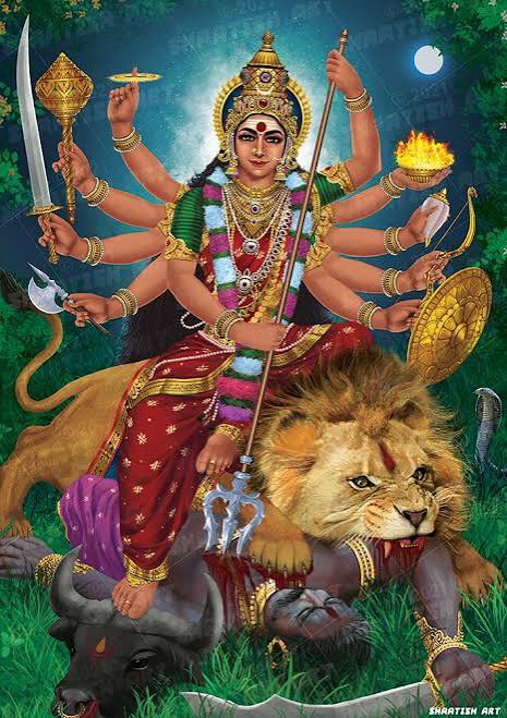Elle est également connue sous les noms de Durgā, Chandi, Amman, Mariamman ou Kali-Durga, selon les régions. Elle est célébrée comme la Protectrice des univers, la Victrice du mal, la Guerrière cosmique et la Mère compatissante qui combat les forces menaçant l’ordre (Dharma).