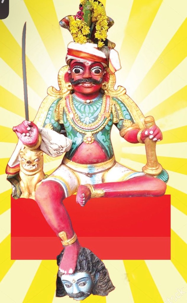 Dans certaines traditions, on dit qu’il se tient à la frontière du village, un peu comme Ayyanar dans d’autres régions : il assure la protection à l’extérieur, tandis que la déesse protège l’intérieur.