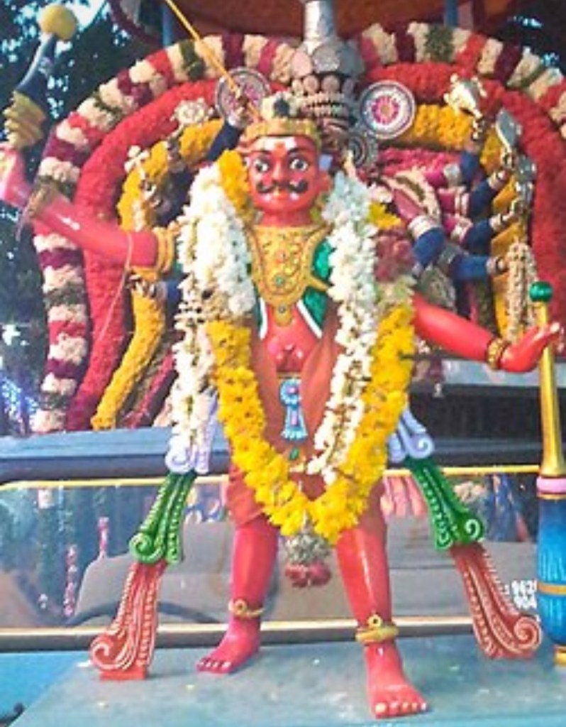 Il est aussi considéré comme le maître des esprits errants : il peut les repousser, les dominer ou les guider au loin, c’est pourquoi son rôle est fondamental dans les temples dédiés à Mariammen, en particulier lors des grandes fêtes religieuses.