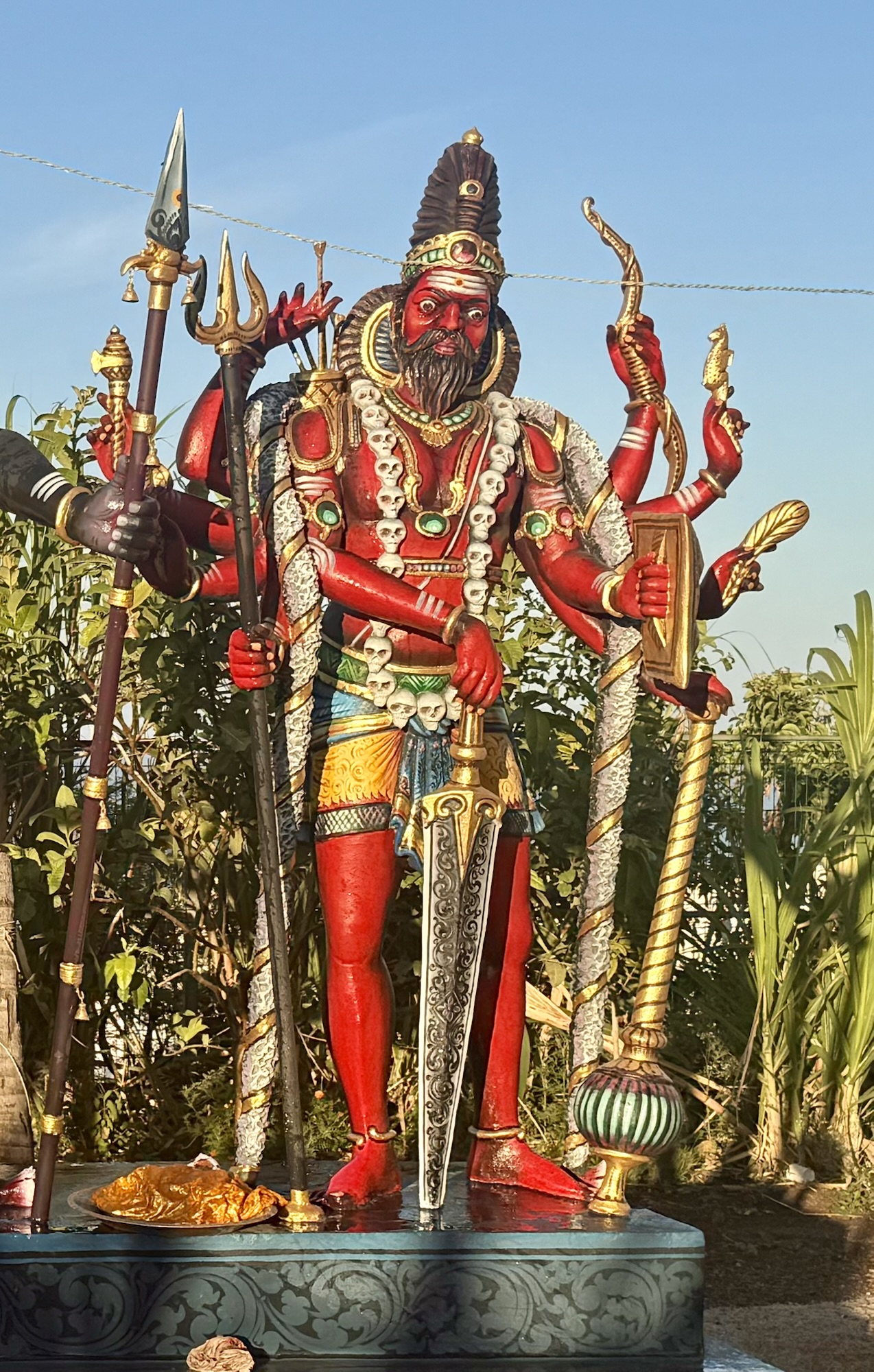 À La Réunion, la figure de Virabhadra n’est pas toujours nommée directement sous son nom sanskrit. Elle apparaît de manière plus diffuse à travers certaines formes de « Veerabathira » ou « Virabathirar », des divinités farouches associées à Shiva dans les services malbar, ou encore des figures gardiennes rapprochées de Muneeswaran, d’Agora Sakti ou d’Agora Veerabhadra, selon les traditions orales et les syncrétismes propres à l’île.
